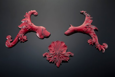 Of the two series of Parades's work included in the Quirk Exhibition, this was my favorite. The other series, which I believe also falls under the "Standards" umbrella as well was visually very different. Again animals are morphed into architectural elements, but this time the animals are domesticated dogs and the shaping is more wavy and flat like what would be found near a room's corner, as well the objects were all in red instead of white. All types of dogs are included in the individual objects, from beagles to greyhounds, but I found myself less interested in this part of the series.